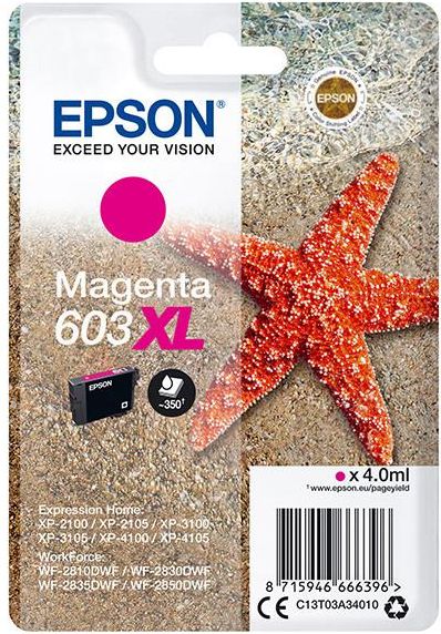 Atrament 603XL Rozgwiazda, pojedyncze opakowanie, Magenta Atrament 603XL Rozgwiazda idealnie nadaje się do niedrogiego i niezawodnego drukowania bez kompromisów. Dostępne w rozmiarach standardowych i XL oraz w opakowaniach pojedyńczych i zbiorczych Multipack, co pozwala na elastyczne zastąpienie tylko takiego koloru, jakiego potrzebujesz. Wybór wkładów w rozmiarach standardowym i XL Łatwe do zidentyfikowania zdjęcie rozgwiazdy Ten przystępny cenowo czterokolorowy atrament, a zarazem niezawodne rozwiązanie do wydruku atramentowego jest owocem szeroko zakrojonych prac badawczo-rozwojowych prowadzonych przez firmę Epson. Produkując wyraźne i żywe wydruki, atrament 603 jest zoptymalizowany do pracy z gamą drukarek firmy Epson. Atrament umożliwia drukowanie różnych dokumentów tekstowo-graficznych. Niedrogi i niezawodny Korzystaj z niezawodnego i wyrazistego druku w intensywnych barwach przy minimalnych wydatkach dzięki czterokolorowemu atramentowi Epson 603. Dzięki połączeniu barwników i czarnych atramentów pigmentowych ten zestaw zapewnia wyraźne i kolorowe wydruki. Zoptymalizowane pod kątem drukarek Epson Atramenty i papier firmy Epson zostały opracowane tak, aby zapewniać doskonałe wyniki za każdym razem, kiedy są stosowane wraz z drukarkami Epson. Oryginalny towar Nieskomplikowane i niezawodne drukowanie dzięki zastosowaniu oryginalnych atramentów firmy Epson. Stawiamy na szczegółowe badania i zaawansowane technologicznie zakłady produkcyjne, a nasze produkty poddajemy rygorystycznym testom, by zapewnić najwyższą jakość. Niższe koszty druku przy korzystaniu z wkładów XL Atramenty XL idealnie nadają się do drukowania dużych ilości materiałów i obniżenia kosztów drukowania. POZOSTAŁE KOLORY Z TEJ SERII: