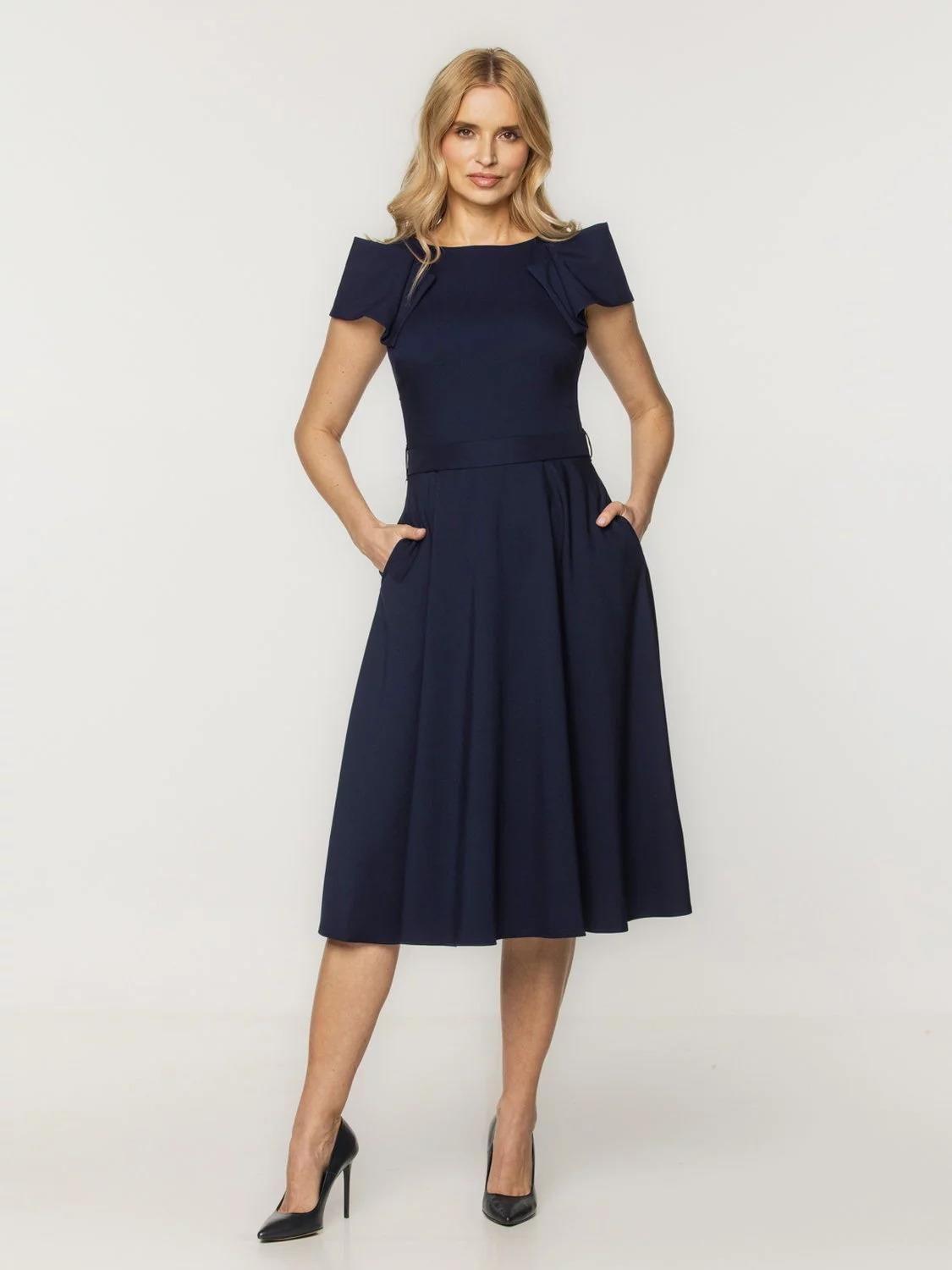 Rozkloszowana sukienka MIDI Rozkloszowana sukienka o długości midi, uszyta z pełnego koła, świetnie sprawdzi się zarówno do pracy, jak i na różnego rodzaju imprezy okolicznościowe. Szerokie ramiączka, zabudowane plecy i dekolt w kształcie łódki dodają sukience elegancji oraz klasy. Forma sukienki i pasek wiązany w talii doskonale modelują sylwetkę, nadając jej kształt klepsydry. Sukienka jest zapinana na zamek błyskawiczny umieszczony na plecach. Kolor główny: granatowa o gładkiej fakturze Rodzaj sukienki: rozkloszowana, długość MIDI, dekolt typu łódka, krótkie, podwijane rękawki Skład tkaniny wierzchniej: 37% wiskoza, 59% poliester, 4% elastan Skład podszewki: 94% poliester, 6% elastan Gwarancja: 24 m-ce Uszyta w Polsce