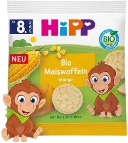 Ekologiczne wafelki kukurydziane mango dla niemowląt od 8. m-ca i małych dzieci. - z ekologicznych zbóż - słodycz tylko z owoców - bez dodatku aromatów Nasze produkty powstają wyłącznie z najlepszych surowców ekologicznych, które podlegają bezkompromisowym kontrolom na każdym etapie - od gleby aż po gotowy produkt. Nasze rozpływające się w ustach Wafelki kukurydziane HiPP BIO są naturalnie łagodne i mają delikatnie owocowy smak. Niewielkie, okrągłe wafelki idealnie pasują do małych rączek.