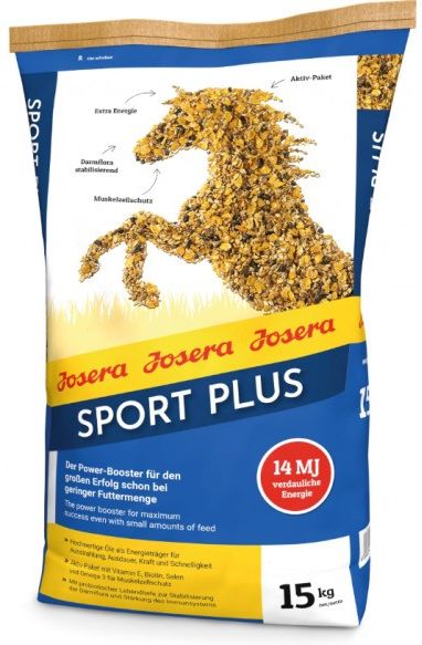 Josera Sport Plus to pasza wysokoenergetyczna i bez owsa dodająca energii dla koni pracujących we wszystkich dyscyplinach.Charyzma, wytrzymałość, siła i prędkość wymagają optymalnego żywienia. Zboże poddane obróbce hydrotermicznej w Josera Sport Plus jest łatwe do strawienia, zapewniając koniowi szybko dostępną energię. Z drugiej strony, wysokojakości oleje roślinne stanowią długotrwałe i trwałe źródło energii, zapewniające wytrzymałość, zwłaszcza podczas długotrwałych aktywności. Dzięki wysokiej zawartości energii, Josera Sport Plus może być również używany jako turbo wzmacniacz w sezonie zawodów.Müsli zawiera zestaw aktywny z witaminą E, selenem i kwasami tłuszczowymi omega-3 z siemienia lnianego. Wspomagają one trwałą ochronę komórek mięśniowych i regenerację silnie obciążonych mięśni. Probiotyczne drożdże żywe zawarte w Josera Sport Plus wspierają wrażliwą florę jelitową aktywnych koni, promując tym samym zdrowe środowisko jelitowe. Ze względu na wysoką gęstość energetyczną, ilość paszy w korytku może być celowo zmniejszana, a przewód pokarmowy konia dodatkowo chroniony.Oczywiście, Josera Sport Plus jest zgodny z normami ADMR. Josera Sport Plus doskonale współgra jako wzmacniacz energii z musli sportowym Josera Aktiv 2.0. W fazach szczególnie intensywnej pracy lub z wysokim zapotrzebowaniem energetycznym, zalecamy zastąpienie 1/3 dawki paszy Josera Aktiv 2.0 Josera Sport Plus lub jej uzupełnienie. Skład:płatki kukurydziane poddane obróbce hydrotermicznej (36,5%); płatki jęczmienne poddane obróbce hydrotermicznej (28%); mączka z traw (11%); olej roślinny, rafinowany (5,8%); otręby pszenne (4,3%); siemię lniane, ekstrudowane (3,3%); kukurydza, ziemia (3,1%); melasa (2,2%); śruta poekstrakcyjna z nasion słonecznika (2%); węglan wapnia (1,2%); chlorek sodu (0,7%); fosforan jednowapniowy (0,5%); suszona pulpa z cykorii (0,4%); tlenek magnezu (0,3%) Składniki analityczne w 1 kg:białko surowe (10,0 %); tłuszcz surowy (10,0 %); włókno surowe (6,0 %); popiół surowy (6,0 %); skrobia (40,0 %); cukier (3,6 %); wapń (0,9 %); fosfor (0,40 %); sód (0,30 %); magnez (0,30 %); energia metaboliczna (DE) (13,5 MJ); białko surowe metaboliczne (dXP) (7,8 %); lizyna (3,0 g) Dodatki dietetyczne w 1 kg:witamina A (3a672a) (9.600 I.E.); witamina D3 (3a671) (960 I.E.); witamina E / octan d-alfa tokoferylu (675 mg); witamina C (200 mg); witamina B1 (21 mg); witamina B2 (21 mg); witamina B6 (18 mg); witamina B12 (180 mcg); niacynoamid (120 mg); D-pantotenian wapnia (60 mg); kwas foliowy (16 mg); biotyna (1.200 mcg); chlorek choliny (300 mg); cynk (uwodniony glicynowy chelat cynku (postać stała) (3b607)) (129 mg); cynk (tlenek cynku (3b603)) (129 mg); mangan (tlenek manganu(II) (3b502)) (120 mg); miedź (glicynowy chelat miedzi(II), hydrat (w postaci stałej) (3b413)) (30 mg); miedź (pentahydrat siarczanu miedzi(II) (3b405)) (30 mg); jodyna (bezwodny jodan wapnia (3b202)) (1,20 mg); selen (selenin sodu (3b801)) (1,10 mg)...