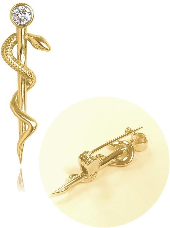 MINET Pozłacana srebrna broszka laska Eskulapa z białą cyrkonią Wejherowo