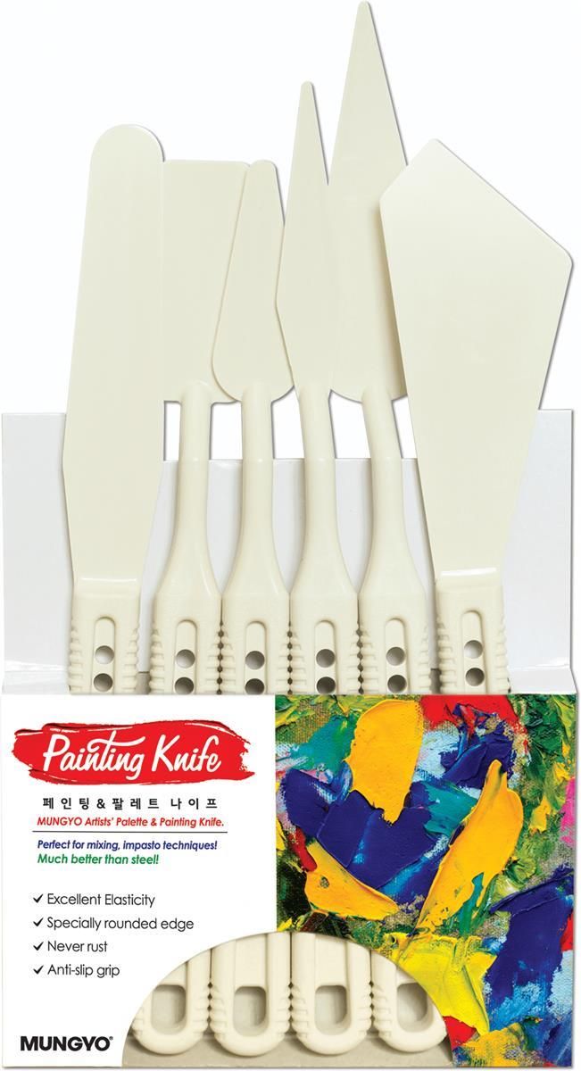 Komplet Szpachli Malarskich Mungyo Wyjątkowo trwałe szpachle malarskie wykonane są z elastycznego i odpornej na uszkodzenia syntetycznego materiału. W zestawie dostępne są narzędzia o zróżnicowanych kształtach, które umożliwiają uzyskanie unikalnej struktury w twoich dziełach malarskich. Materiał, którego użyto do wytworzenia tych szpachli, jest odporny na działanie rozpuszczalników takich jak terpentyna, co czyni je idealnym narzędziem do malarstwa olejnego, a także akrylowego czy terpentynowego.Szpachle te przede wszystkim wykorzystuje się do nanoszenia, mieszania i rozsmarowywania farby na obrazie. Pozwalają one na nałożenie grubej warstwy farby na płótno i nadanie jej specyficznego, trójwymiarowego efekty. Wszystko zależy od wielkości i formy użytej szpachli, co pozwala na uzyskanie różnorodnych efektów w zależności od preferencji autora. Szpachle umożliwiają również uzyskanie wyrazistych granic między różnymi kolorami.Produkty te charakteryzują się wysoką trwałością, są solidnie wykonane z materiałów najwyższej klasy. Dostępne są w różnych rozmiarach i kształtach, a odpowiednio konserwowane mogą służyć przez długie lata. Szpachle można łatwo utrzymać w czystości, ponieważ pozwalają na całkowite mycie i czyszczenie.Duży nacisk położono również na praktyczność tych narzędzi - posiadają one elastyczne ostrza oraz ergonomiczne, funkcjonalne uchwyty. EAN: 8807093300015