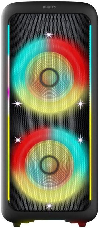Philips TAX5000E/10. Typ głośnika: 2-drożny, Średnica głośnika wysokotonowego: 5,08 cm (2"), Średnica głośnika niskotonowego (imperial): 20,3 cm (8"). Moc wyjściowa (RMS): 100 W, Zasięg częstotliwości: 20 - 20000 Hz, Impedancja: 4 Ω. Technologia łączności: Przewodowy i Bezprzewodowy, Profile Bluetooth: A2DP, AVRCP, SBC, Pasmo Bluetooth: 10 m. Typ produktu: Głośnik imprezowy, Kolor produktu: Czarny, Regulacja głośności: Obrotowy. Rekomendowane użycie: Uniwersalne