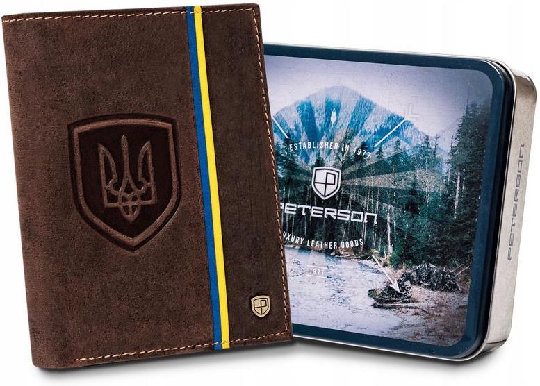 Skórzany portfel męski bez zapięcia z systemem RFID — Peterson Najwyższa jakość i precyzja wykonania | Odszyty bardzo trwale z doskonałej jakości skóry naturalnej, która idealnie będzie pasowała do eleganckiego paska czy butów Patriotyczny design | Portfel o klasycznej stylistyce. Model w orientacji pionowej bez zapięcia zewnętrznego. Na froncie mieści się delikatny motyw niebiesko-żółtej flagi oraz wizerunek godła Ukrainy Uporządkuj swoje karty | Portfel będzie dla Ciebie idealny, jeżeli na co dzień nosisz sporo dokumentów, ponadto zmieścisz w nim pokaźne ilości kart oraz gotówki Bezpieczeństwo na najwyższym poziomie | Wyposażony w technologię RFID BLOCKING SYSTEM, która zabezpiecza karty zbliżeniowe, dokumenty biometryczne, legitymacje i karty komunikacji miejskiej przed nieautoryzowanym odczytem danych ZAPAKOWANY NA PREZENT Kupując ten portfel, dostajesz elegancko zapakowany kompletny prezent, który jest gotowy do podarowania go bliskiej osobie. Z portfelem otrzymujesz zawsze: metalowe eleganckie pudełko (piękna ozdobna firmowa puszka widoczna na aukcji) komplet firmowych metek Wymiary opakowania: 12x14,5x4 cm. Mnóstwo miejsca na Twoje karty Środek portfela został zaprojektowany tak, abyś mógł zmieścić wszystkie karty, dokumenty i pieniądze, które na co dzień potrzebujesz. Dodatkowo wnętrze obszyto logowaną podszewką, która chronić będzie skórę przed uszkodzeniami. Wewnątrz znajdziesz 1 pojemną kieszonkę na bilon; podwójną przegrodę na banknoty; 4 schowki na duże dokumenty, w tym 2 formie okienka; 11 miejsc na karty płatnicze, wizytówki i dokumenty o standardowym formacie, w tym 1 w formie okienka 1 schowek na suwak w centralnej części portfela. Sekcja na gotówkę W kieszeniach na monety i banknoty zmieścisz pokaźną ilość gotówki. bilon schowasz do 1 kieszeni zapinanej napą; banknoty schowasz do 2 otwartych kieszeni. Dodatkowa tylna kieszeń Kieszeń z tyłu portfela stanowi dużą wygodę. Zmieścisz w niej katę, którą używasz najczęściej lub może posłużyć jako miejsce na jednorazowe bilety komunikacji miejskiej. Zdecyduj sam!