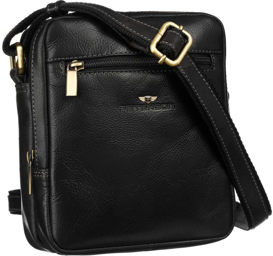 Skórzana torba męska do pracy — Peterson Polska marka | Produkt renomowanej marki wyróżniającej się niebanalnym stylem oraz wysoką jakością wykonania Skóra najwyższej jakości | Odszyta z wysokogatunkowej skóry naturalnej, lekko połyskującej. Wykorzystanie starannie wyselekcjonowanych materiałów jest gwarancją długiego użytkowania Ponadczasowy design | Listonoszka zamykana zamkiem błyskawicznym. Wszystkie okucia w torebce mają piękny kolor starego złota, co tworzy świetny kontrast dla czarnego koloru skóry Funkcjonalna | Torebka pomieści najpotrzebniejsze drobiazgi jak portfel czy telefon. Wyposażona w 1 kieszeń wewnętrzną i 2 zewnętrzne Solidne wykończenie | Środek wyściełano praktyczną podszewką w czarnym kolorze. Takie wykończenie to podstawa, jeżeli wnętrze listonoszki ma pozostać w nieskazitelnym stanie przez długie lata! Wygoda i komfort noszenia | Listonoszka zawieszona na długim, regulowanym pasku o solidnym mocowaniu Niezwykle atrakcyjna cena! Ponadczasowa listonoszka Każdy z nas w obecnych czasach jest w posiadaniu przedmiotów, bez których nie można ruszyć się na krok. Telefon, portfel... Nie zawsze jesteśmy w stanie zmieścić je do kieszeni. Nie zawsze też istnieje potrzeba zabierania ze sobą dużej torby czy plecaka. Nasza torebka to gwarancja bardzo wysokiej jakości oraz tego, że posłuży Ci wiele lat. Bardzo dobra organizacja Torebka ma 2 komory, do których dostępu strzeże zamek błyskawiczny. Wnętrze jednej z nich wyposażono w kieszonkę zapinaną na suwak. To idealne miejsca na Twoje dokumenty lub inne drobiazgi. Tył listonoszki zawiera kolejną, zamykaną bezpiecznym suwakiem kieszeń - tą polecamy wykorzystać do ważniejszych dokumentów czy drobiazgów! Dodatkowo, listonoszka posiada jedną otwartą kieszeń na froncie pod klapką. Całość na materiałowej podszewce, która chronić będzie skórę przed uszkodzeniami podczas wkładania i wyjmowania z niej przedmiotów. Komfort noszenia Listonoszka zawieszona jest na długim, regulowanym parcianym pasku. Regulacja umożliwi Ci idealne dopasowanie do Twojej sylwetki i wzrostu. Maksymalna długość paska to 150 cm.