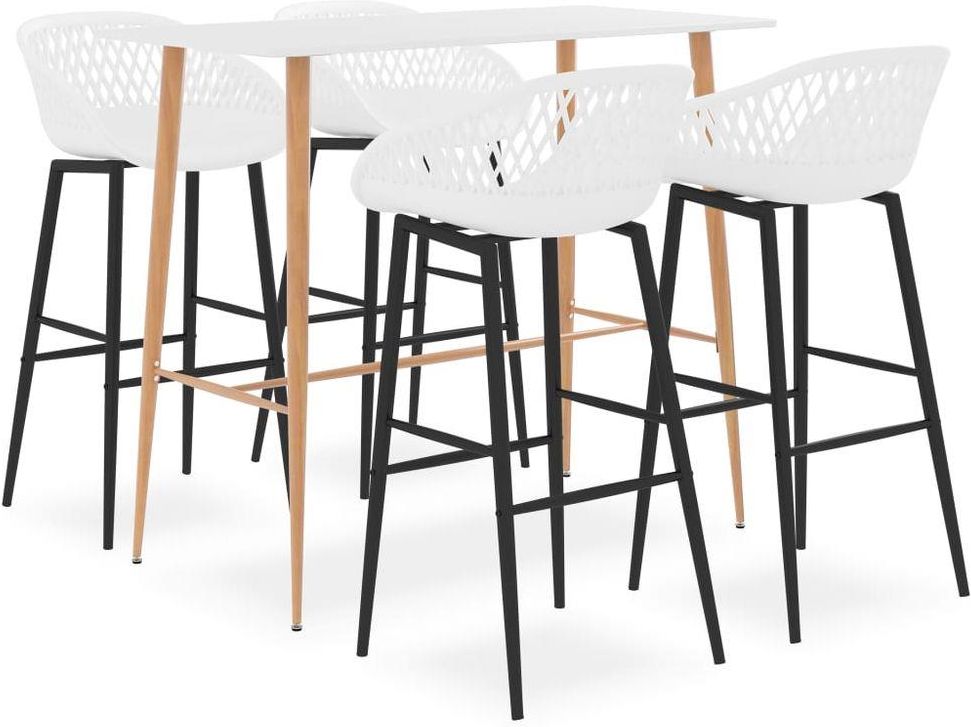 Nasz zestaw mebli barowych o innowacyjnym i współczesnym wzornictwie jest idealny do każdego nowoczesnego domu, ogrodu, baru, pubu lub restauracji. Jego prosta i świeża forma dopełni dowolny wystrój wnętrza. Nasz stolik ma wytrzymały blat z MDF i mocne metalowe nogi o wyglądzie drewna. Stołki barowe posiadają ergonomicznie zaprojektowane siedziska ze zintegrowanym, niskim oparciem o siateczkowej konstrukcji. Wykonane z wytrzymałego PP i wsparte na metalowych, malowanych proszkowo, mocnych nogach hokery są solidne i trwałe. Stolik barowy: Kolor: biały Materiał: MDF, metal Wymiary: 120 x 60 x 105 cm (dł. x szer. x wys.) Nogi z powłoką termotransferową imitującą drewno Stołki barowe: Kolor: biały Materiał: PP, metal Wymiary: 48 x 47,5 x 95,5 cm (szer. x gł. x wys.) Wysokość siedziska nad ziemią: 74,5 cm Niskie, kratkowane oparcie Wymagany montaż: tak Zawartość przesyłki: 1 x stolik barowy 4 x stołek barowy Maksymalnie 110 kg na siedzisko.