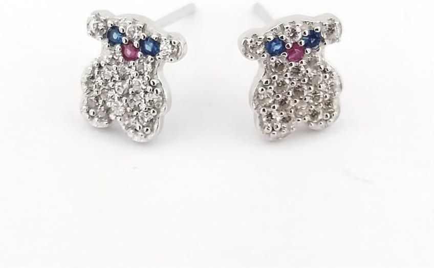 Wyjątkowe, srebrne kolczyki w kształcie misia z pięknymi cyrkoniami w 3 kolorach. Białym, niebieskim i różowym. Srebrne kolczyki zostały wykonane z ogromną precyzją, przez co są produktem najwyższej jakości. Do produkcji użyto srebra próby 925. Poznaj nasze pozostałe produkty i stwórz idealny zestaw! Zabłyśnij z biżuterią Susetti!