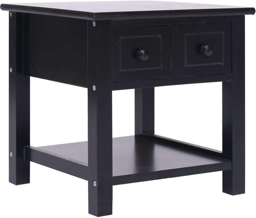 Stolik boczny, czarny, 40 x 40 x 40 cm, drewno paulownia Nasz drewniany stolik boczny będzie stanowił praktyczny i ozdobny dodatek do Twojego wnętrza. Sprawdzi się także jako szafka pod telefon, szafka nocna itp. Wykonany z drewna paulownia i płyty MDF ten stolik kawowy jest trwały i solidny. Dzięki 2 szufladom i dolnej półce zapewni przestrzeń do przechowywania. Stabilny blat posłuży do wyeksponowania przedmiotów dekoracyjnych, ramek ze zdjęciami czy roślin doniczkowych. Łatwo będzie go wyczyścić, wystarczy jedynie wilgotna ściereczka. Stolik boczny jest prosty w montażu. Kolor: czarny Materiał: drewno paulownia + blat z MDF Wymiary: 40 x 40 x 40 cm (szer. x gł. x wys.) Z 2 szufladami
