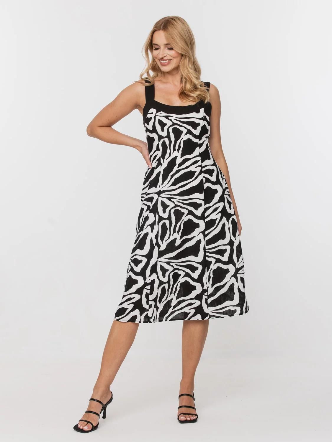 Wzorzysta sukienka na szerokich ramiączkach Dopasowana sukienka na szerokich ramiączkach w modny, czarno-biały wzór przypominający zebrę lub cętki. Ma kwadratowy dekolt i lekko rozkloszowany dół, który pięknie układa się w ruchu, a ukryty zamek na plecach ułatwia zakładanie. Stylizacja: Sukienka ta, to idealny wybór na wakacje, spotkania i codzienne wyjścia. Świetnie komponuje się z minimalistycznymi sandałami, espadrylami lub klapkami, a w chłodniejsze wieczory możesz zestawić ją z jasnym kardiganem, białą koszulą, czy jeansową kurtką. Dodaj plecioną torebkę i gotowe! Kolor główny: czarno-biały wzór Rodzaj sukienki: rozkloszowana, długość MIDI, szerokie ramiączka Skład tkaniny: 55% bawełna, 45% wiskoza Skład podszewki: 65% wiskoza, 35% poliamid Gwarancja: 24 m-ce Uszyta w Polsce