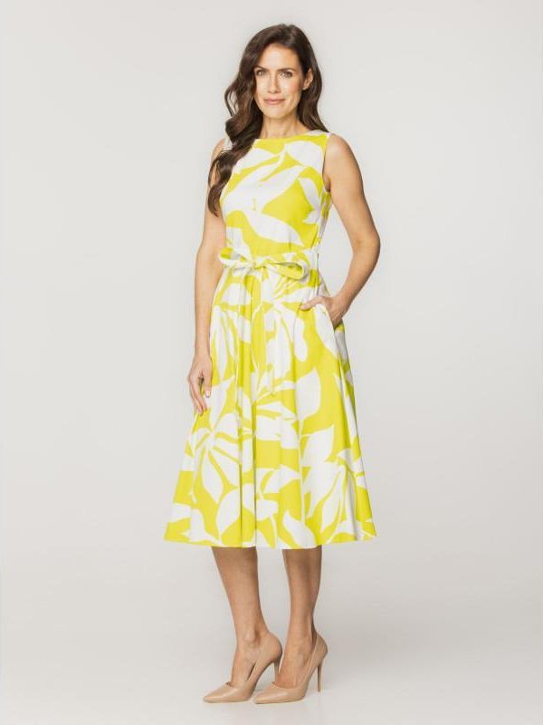 Rozkloszowana sukienka MIDI Rozkloszowana sukienka o długości midi, uszyta z pełnego koła, świetnie sprawdzi się zarówno do pracy, jak i na różnego rodzaju imprezy okolicznościowe. Szerokie ramiączka, zabudowane plecy i dekolt w kształcie łódki dodają sukience elegancji oraz klasy. Forma sukienki i pasek wiązany w talii doskonale modelują sylwetkę, nadając jej kształt klepsydry. Sukienka jest zapinana na zamek błyskawiczny umieszczony na plecach. Kolor główny: białe i limonkowe kwieciste wzory Rodzaj sukienki: rozkloszowana, długość MIDI Skład tkaniny wierzchniej: 97% bawełna, 3% elastan Skład podszewki: 98% poliester, 2% elastan Gwarancja: 24 m-ce Uszyta w Polsce