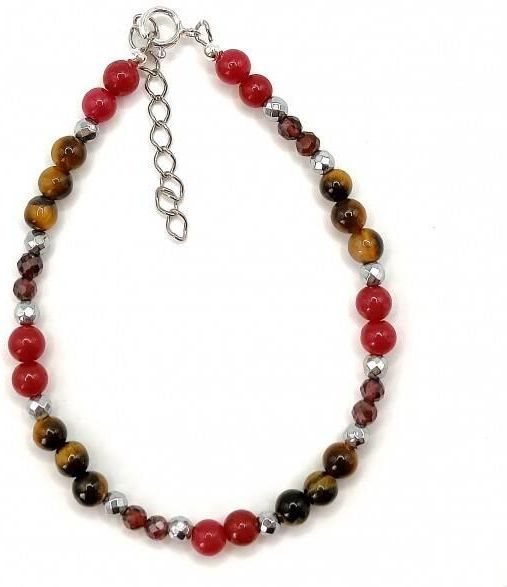 Bransoletka wykonana ze srebra próby 925, pozłacanego 24 karatowym złotem Kamień: Koral + Tygrysie oko + Granat i Hematyt Rozmiar kamienia: 4/2mm Długość: 17,5 cm Zapięcie: federing Bransoletka może być wykonana na gumce- prosimy o informację w uwagach do zamówienia Biżuteria ręcznie wykonana, produkt Polski.