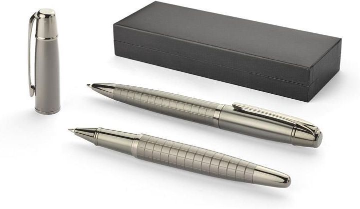 Elegancki zestaw prestiżowej marki GESSTOR cechującej produkty wysokiej jakości o unikatowym wzornictwie. Czarne pudełko zawiera długopis oraz pióro kulkowe w kolorze grafitowym. Oba elementy wykonane są w całości z metalu, w dolnej części ozdobione ciekawą fakturą kratki. Elementy posiadają oznaczenie marki Gesstor na końcówkach. Znakowanie jest możliwe na długopisach oraz na pudełku - w tym celu skontaktuj się z nami.