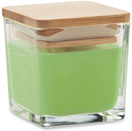 Świeca zapachowa 50gr Stan: Nowy Wymiary (cm): 5,2 x 5,2 x 5,7 cm Waga (kg): 0,238 Kolory: Limonka Materiał: Szkło Zapachowa świeca woskowa na bazie roślin w kwadratowym szklanym pojemniku z bambusową pokrywką. 50 gr. Czas palenia: 8 godzin. Biały (06) zapach waniliowy, żółty (08) zapach cytrynowy, …