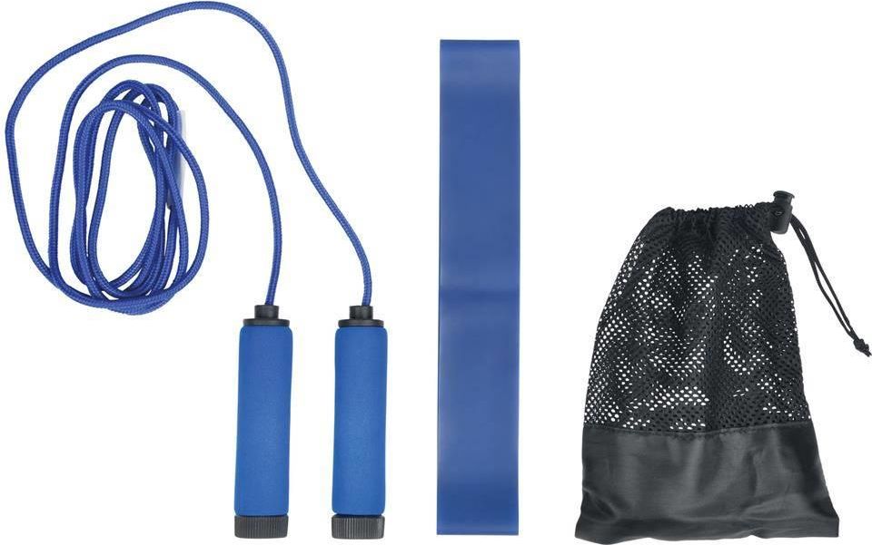 Zestaw fitness STRETCH & JUMP, czarny, niebieski Kolory: czarny, niebieski Waga: 0.13kg Zestaw fitness STRETCH & JUMP: skakanka regulowana na długość (max. 260 cm z rączkami) oraz gumy oporowe (długość 60 cm, opór ok. 6,8 kg), w czarnej siatkowej torbie