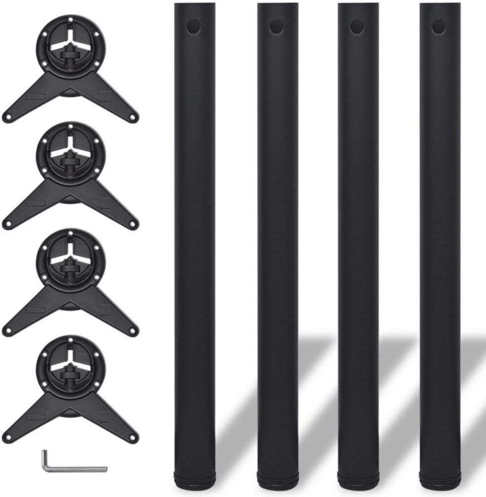 Zestaw 4 wysokiej jakości nóg, który sprawdzi się przy stołach, biurkach i blatach roboczych, jako element wymienny. Wykonanie z wysokiej jakości materiałów zapewnia, że będą stabilne i trwałe. Możliwość regulacji pozwala na dostosowanie wysokość, co sprawdzi się świetnie na przykład w przypadku krzywej podłogi. Montaż jest bardzo prosty i szybki. Kolor: czarny Materiał rurki: żelazo Materiał wykonania płytek montażowych: Hartowany cynk Wymiary: 60 x 710 mm (śr. x wys.) Regulowana śruba - pozwala na regulację wysokości od 710 mm do 720 mm Może być stosowany jako nogi barowej lady kuchennej, nogi stołowe, nogi blatu roboczego lub nogi biurka Bardzo mocne i stabilne Szybki i prosty montaż Zawartość przesyłki: 4 x rura 4 x stopa 4 x płyta montażowa 4 x śruba 1 x klucz imbusowy