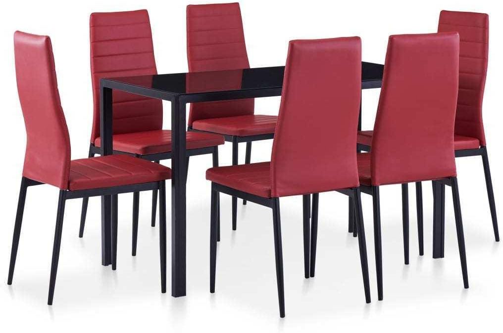 Nowoczesny i elegancki zestaw mebli w skład którego wchodzi 7 elementów to idealny produkt dla osób, które chcą dodać stylu wnętrzu swojego domu. Blat stołu został wykonany z mocnego, hartowanego szkła, które można łatwo wyczyścić. Każde krzesło jest obite wysokiej jakości sztuczną skórą. Miękkie, wypełnione siedzisko jest bardzo wygodne. W skład przesyłki wchodzi 1 stół i 6 krzeseł. Kolor: winna czerwień Materiał stołu: hartowane szkło i żelazna rama Materiał krzesła: sztuczna skóra + drewniana rama + żelazne nogi Wymiary stołu: 120 x 60 x 74 cm (dł. x szer. x wys.) Wymiary krzesła: 43 x 50 x 96 cm (szer. x gł. x wys.) Wymiary siedziska: 43 x 39 cm (szer. x gł.) Wysokość siedziska nad ziemią: 46 cm W skład przesyłki wchodzi 1 stół i 6 krzeseł Materiał: Bawełna: 5%, PCV: 95%