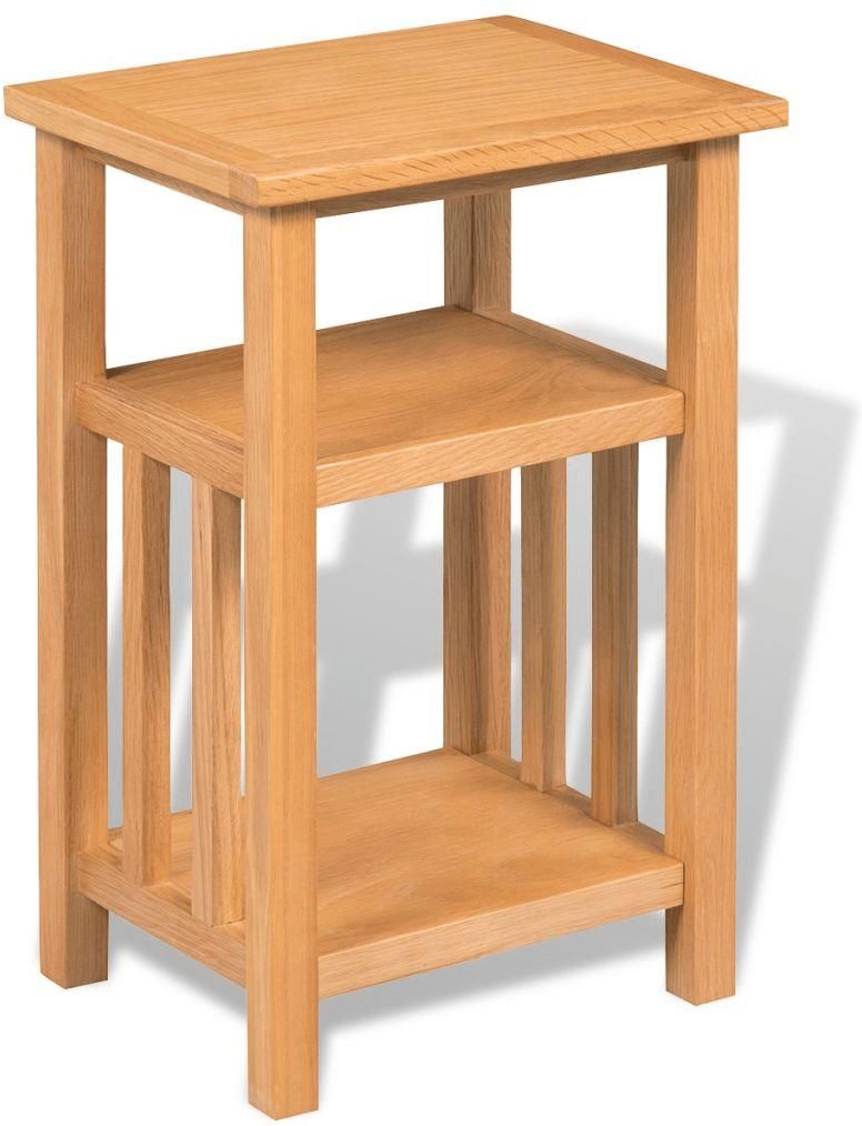 Nasz drewniany stolik będzie pasował do każdego wystroju wnętrza. Stanowi on znakomity wybór do Twojego pokoju dziennego, jadalni lub sypialni. Mebel ten został umiejętnie wykonany z trwałego, litego drewna dębowego i jest bardzo funkcjonalny. Dzięki kompaktowej formie zajmuje on mało miejsca i można go łatwo przestawiać. Mocny blat nadaje się znakomicie do postawienia przedmiotów dekoracyjnych, zdjęć lub roślin doniczkowych. Stolik ma dwie półki, które służą do przechowywania czasopism i gazet. Kolor: brązowy Materiał: lite drewno dębowe, okleina MDF Wymiary: 27 x 35 x 55 cm (dł. x szer. x wys.) Z 2 półkami, które świetnie się nadają do przechowywania gazet i czasopism.