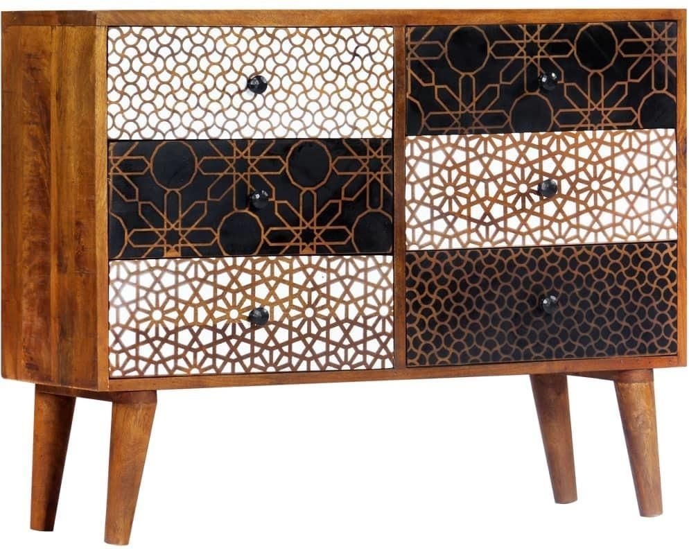 Szafka z nadrukiem, 90 x 30 x 70 cm, lite drewno mango Wprowadź do swojego wnętrza luksusowy design, inspirowany stylem połowy XX wieku, za sprawą naszej pięknej, drewnianej komody! Wyposażona w 6 szuflad, zapewniających mnóstwo miejsca do przechowywania, szafka będzie prawdziwie praktycznym i …