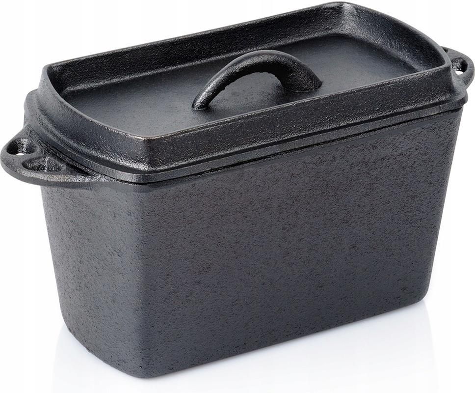 Forma do chleba z pokrywką żeliwna CAST LINE 27 cm, 2 l Forma do pieczenia z pokrywką - Prostokątna forma z pokrywką do pieczenia chleba, lasagne, keksu, zapiekanek, mięsa lub pasztetu. Idealnie sprawdzi się do wypiekania ucieranych ciast oraz drożdżowych. Wymiary zewnętrzne formy bez pokrywki to 27 x 12 x 12 cm, wysokość z pokrywką wynosi 14,5 cm. Pojemność formy to 2 l. Wykonana w całości z żeliwa - Wykonana w całości z odlewu żeliwa. Naczynia wykonane z żeliwa idealnie rozprowadzają ciepło oraz długo utrzymują wysoką temperaturę. Odporna na wysokie temperatury - Forma jest odporna na wysokie temperatury, co pozwala na gotowanie, duszenie oraz pieczenie potraw. Posiłki można przygotowywać w nim na piecu, bezpośrednio na ogniu, a także w piekarniku. Nadaje się na kuchnie gazowe, elektryczne, ceramiczne, halogenowe oraz indukcję. Przydatna pokrywka - Dołączona do zestawu pokrywka pozwoli nadać odpowiedni kształt wypiekanym potrawom, dzięki niej uzyskamy idealny kształt podczas wypieków chleba tostowego. Forma posiada dwa uchwyty, które zapewnią wygodne przenoszenie. Uniwersalne zastosowanie - Doskonała do przygotowywania domowego pieczywa, ciast i pasztetów, a także jako brytfanna do pieczenia mięs, zapiekanek, lasagne czy warzyw. Przydatna w każdej kuchni, jak i do profesjonalnego wypieku w restauracjach. Prostokątna forma do pieczenia chleba oraz innych potraw. Prostokątny kształt, jest idealny do wypieku chleba tostowego, pasztetu, babki czy keksu. Solidnie wykonana, odpowiednio użytkowana będzie służyła długie lata. Dzięki właściwościom żeliwa równomiernie rozprowadza ciepło, co pozwala uzyskać doskonałe rezultaty pieczenia i zachować pełnię smaku przygotowywanych potraw. ❗️UWAGA! Po każdym użyciu umyć, wytrzeć suchą szmatką do sucha i natłuścić - w przeciwnym razie na naczyniu pojawi się rdza, co jest naturalnym procesem dla tego typu materiału. Naczynie nie posiada żadnych powłok typu "teflon". Regularna pielęgnacja zapobiega korozji i zapewnia długotrwałe użytkowanie naczynia. Oryginalny produkt marki Vilde z linii Cast Line. Wyprodukowano zgodnie z europejskimi standardami.