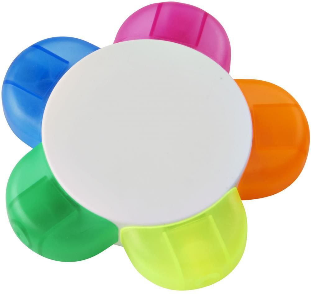 Zakreślacz w kształcie kwiatka zawiera pięć kolorów: pomarańczowy, różowy, niebieski, zielony i żółty.