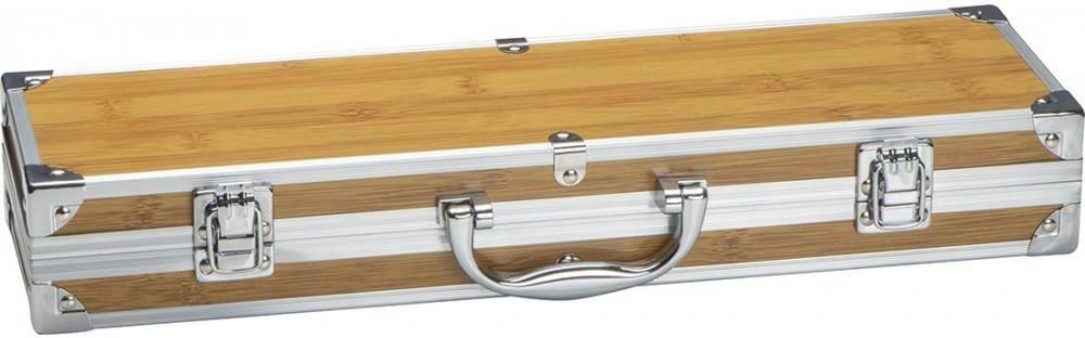 3-częściowy zestaw do grilla w porzęcznej walizce ze wstawkami z bambusa. Wewnątrz znajdują się szczypce, widelec do mięsa i szpatułka.