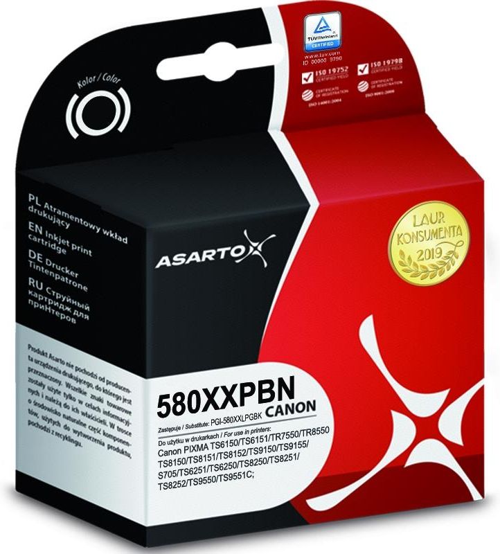 Produkty Asarto opracowano z myślą o wydajności, oszczędności i niezawodności. Produkty Asarto posiadają właściwości fizyko-chemiczne oraz techniczne równe lub wyższe niż oryginalne. To znaczy, że kartridże Asarto pozwalają na wydrukowanie znacznie większej liczby stron niż oryginalne kartridże. Produkty Asarto zostały przebadane w testach drukujących przy 5% zaczernieniu strony wg normy ISO 24711. Jakość wydruków jest dobra, a niezawodność kartridża wysoka. Kartridże Asarto są w pełni kompatybilne z urządzeniem, do którego są przeznaczone. Ich użycie nie narusza warunków gwarancji producenta OEM. Marki i nazwy drukarek i kartridży zamieszczone to zastrzeżone znaki ichproducentów. Zostały użyte wyłącznie w celach informacyjnych. Zamiennik/Oryginał:: Zamiennik Rodzaj wkładu:: nowy Producent:: Asarto Producent OEM:: Canon Kod OEM:: 1970C001 Kolor:: black (czarny) Ilość w opakowaniu: [szt.]: 1 Wydajność OEM (przy 5% pokryciu strony A4): [str.]: 600 Wydajność (przy 5% pokryciu strony A4): [str.]: 600 Raport ISO: NIE Certyfikat TUV M+T: NIE Więcej informacji:: www.asarto.pl Typ:: 580XXPBN Test video tuszów Asarto:: Lepsze od oryginałów? Prawda czy fałsz? Ilość w opakowaniu:: 1 Wydajność OEM (przy 5% pokryciu strony A4):: 600 Wydajność (przy 5% pokryciu strony A4):: 600 Kolor: black (czarny) kolor: black (czarny) Wydajność (wg normy producenta):: 600 Video testy:: https://www.asarto.pl/centrum-komunikacji/informacje-prasowe/4887-technostrefa-testuje-tusze-asarto-na-youtube.html Kompatybilne urządzenia:: Canon PIXMA TR7550; Canon PIXMA TR8550; Canon PIXMA TS6150; Canon PIXMA TS6151; Canon PIXMA TS6250; Canon PIXMA TS6251; Canon PIXMA TS705; Canon PIXMA TS8150; Canon PIXMA TS8151; Canon PIXMA TS8152; Canon PIXMA TS8250; Canon PIXMA TS8251; Canon PIXMA TS8252; Canon PIXMA TS9150; Canon PIXMA TS9155; Canon PIXMA TS9550; Canon PIXMA TS9551C; Bezpieczeństwo:: Produkty powinny być przechowywane w miejscach niedostępnych dla dzieci oraz zwierząt. kontakt z tuszem: Unikaj wszelkiego kontaktu z tuszem. Zalecamy używania rękawic ochronnych przy wymianie kartridża z tuszem. W przypadku kontaktu tuszu ze skórą umyj dokładnie miejsce wodą ze środkiem czyszczącym, np. mydłem. W przypadku kontaktu z ustami/oczami przemyj je czystą wodą. Jeżeli wystąpi podrażnienie skontaktuj się z lekarzem. W przypadku połknięcia tuszu natychmiast skontaktuj się z lekarzem. W przypadku wycieku tuszu unikaj wdychania oparów. Natychmiast wyczyść powierzchnię, na którą został wylany tusz. Możesz do tego użyć ręczników papierowych lub chusteczek. Przechowywanie produktów: Przechowuj tusz w miejscu suchym, z dala od źródeł ciepła. Zarówno podwyższona wilgotność jak i bezpośrednie oddziaływanie ciepła lub promieni słonecznych negatywnie wpływają na jakość i wydajność produktu. Utylizacja produktów: Nie wyrzucaj zużytych produktów do odpadów zmieszanych. Nie wylewaj resztek tuszu. Zużyty produkt zutylizuj w punkcie PSZOK albo zwróć do miejsca, w którym kupiłeś produkt. Użytkowanie produktów: Przed użyciem produktu zapoznaj się z instrukcją obsługi. Upewnij się, że produkt może być używany w urządzeniu, w którym zamierzasz go zamontować. Nie próbuj samodzielnie uzupełniać tusz w kartridżu. Jeżeli tusz rozleje się w drukarce natychmiast wyłącz urządzenie i ostrożnie usuń tusz. Unikaj używania silnych środków chemicznych do czyszczenia urządzenia. Nie używaj produktów uszkodzonych.