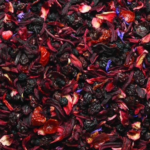 Czarna borówka, dobra na wzrok i krążenie, wprowadza do tej kompozycjinieco cierpką nutę, podczas gdy czerwona czereśnia łagodzi jej smak. Niewielkie czerwone owoce dają jasno czerwoną barwę podczas zaparzania. Ta herbata owocowa nie zawiera kofeiny i nadaje się na lato jako herbata mrożona.Składniki: kwiat hibiskusa, skórka owocu z dzikiej róży, rodzynki, czarna jagoda, dziki bez czarny, bławatek, naturalny aromat Opakowanie zawiera 20 ręcznie szytych saszetek.