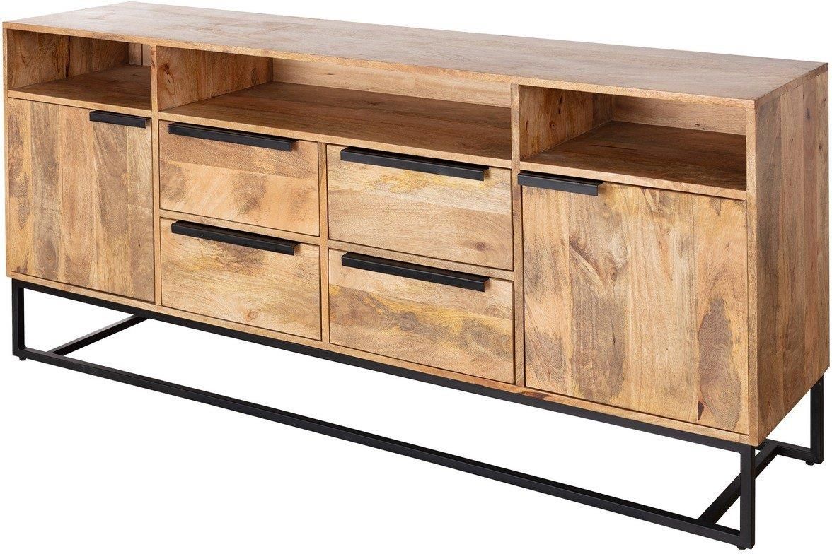 Komoda z szufladami z drewna mango o nowoczesnym designie. Komoda na solidnej metalowej konstrukcji to mebel, który łączy w sobie naturalne piękno drewna z surowością i trwałością metalu. Ta dwudrzwiowa komoda z czterema pojemnymi szufladami to zarówno estetyczne, jak i funkcjonalne rozwiązanie, które doskonale wpisuje się w industrialny styl. Drewno mango to materiał o niewyjątkowej urodzie, charakteryzujący się piękną, naturalną barwą i subtelnymi sękami. Jego niepowtarzalny charakter i ciepło pięknie kontrastuje z metalową konstrukcją w czarnym kolorze. Cztery szuflady wzbogacone o metalowe uchwyty, pomogą w organizacji i uporządkowaniu przestrzeni, przechowując drobne przedmioty czy akcesoria. Komoda z szufladami Orm pełni praktyczną funkcję, a zarazem zachwyca naturalnym pięknem industrialnego stylu. Nadaj Twojemu wnętrzu w stylu loft indywidualny wyraz i sprawdź inne meble serii Orm. Wymiary: szer. 170 cm, gł. 40 cm, wys. 87 cm. Materiał: drewno mango / metal. Kolor: naturalny / czarny.