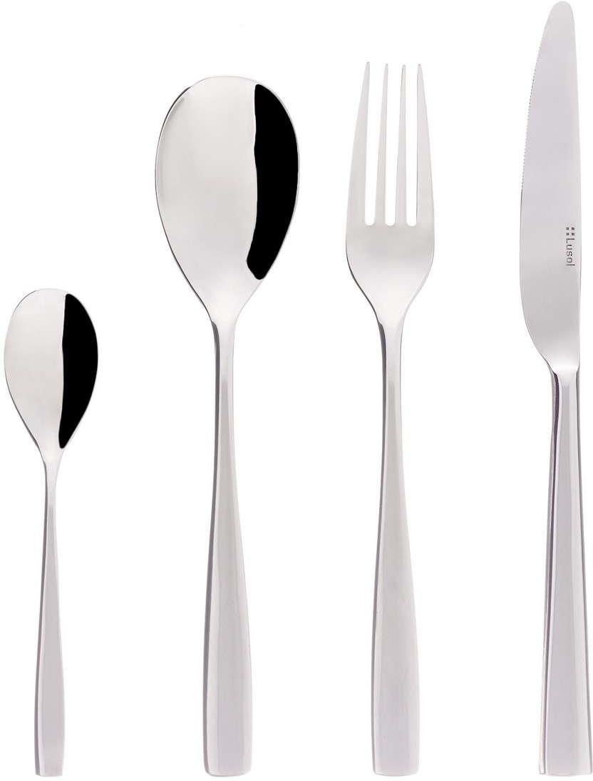 Sztućce Claris komplet dla 6 osób 24 części, 25 x 28 x 8 cm Kod produktu: 814-745 Komplet sztućców wykonanych ze stali nierdzewnej w kolorze srebrnym. Klasyczne piękno i wyjątkowy design zaklęte w zestawie sztućców, składającym się z 24 części. Nowoczesna forma oraz prosta rękojeść bez zdobień, doskonale sprawdzą się podczas serwowania posiłków. Ich uniwersalny charakter sprawia, że wyjątkowo komponują się z zastawą stołową w każdym stylu. Sztućce Claris są idealne w codziennym użytkowaniu oraz w trakcie rodzinnych uroczystości, jako praktyczne i eleganckie uzupełnienie stołowej zastawy. Zapakowane w ozdobne pudełko są ciekawą propozycją na wyjątkowy prezent okolicznościowy, np. ślubny. Produkt wykonany ze stali nierdzewnej Sztućce można myć w zmywarce. Komplet zawiera: 6 łyżek, 6 łyżeczek, 6 widelców, 6 noży. Materiał: stal nierdzewna. Wykończenie: błyszczące. Kolor: srebrny. Dane produktu Rozmiar: 25 x 28 x 8 cm