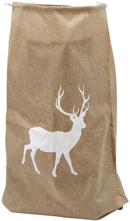 Worek na prezent Z materiału przypominającego jutę z nadrukiem renifera Piękny worek Mikołaja na świąteczne prezenty! Worek ma kolor juty i duży, biały nadruk w kształcie renifera. Produkt wykonany w 100% z poliestru. Materiał przypominający jutę, nadruk z reniferem