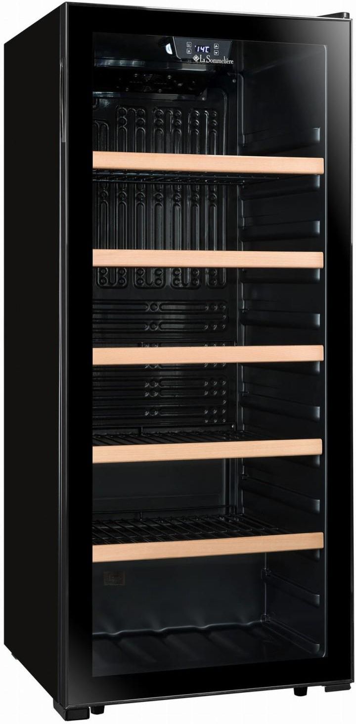 Winiarka LA SOMMELIERE LS117BLACK wolnostojąca o pojemności użytkowej 242 l (mieści 121 butelek), klasa efektywności energetycznej G. Elektroniczne sterowanie, wewnętrzne oświetlenie LED. Wyposażona została w 5 metalowych półek z frontem drewnianym.