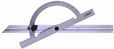 Kątomierz Limit 25500109 cechy: Precyzyjnie wykonany Wykonany ze stali Podziałka 10-170° Ruchome ramię jest przesuwne i może być ustalane w dowolnym miejscu wzdłuż całej długości prowadnicy Kątomierz o długości ramienia 300 mm Średnica tarczy 150 mm