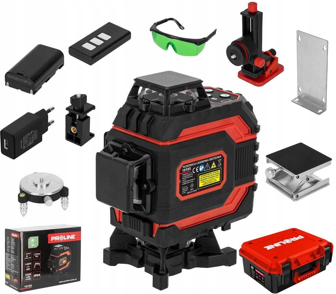 Poziomica laserowa 360 laser krzyżowy zielony samopoziomująca, 4D zestaw Proline 15193 Profesjonalna poziomnica laserowa PROLINE 4D to niezastąpione narzędzie dla fachowców ceniących precyzję, niezawodność i wygodę pracy. Wyposażona w cztery zielone promienie laserowe 360°, zapewnia pełne pokrycie pomieszczenia oraz niezwykłą widoczność – zielona wiązka jest nawet czterokrotnie lepiej dostrzegalna niż tradycyjna czerwona. Poziomica laserowa 360 laser krzyżowy zielony samopoziomująca 4D zestaw Proline 15193 Profesjonalna poziomnica laserowa PROLINE 4D to niezastąpione narzędzie dla fachowców ceniących precyzję, niezawodność i wygodę pracy. Wyposażona w cztery zielone promienie laserowe 360°, zapewnia pełne pokrycie pomieszczenia oraz niezwykłą widoczność – zielona wiązka jest nawet czterokrotnie lepiej dostrzegalna niż tradycyjna czerwona. Najważniejsze parametry techniczne Certyfikat CE – zgodność z normami bezpieczeństwa Klasa szczelności IP54 – odporność na pył i zachlapania Dokładność: ±1,5 mm / 5 m Moc lasera: ≤1 mW Długość fali: 520 ± 10 nm (laser zielony, klasa 2) Zakres pracy: do 25 m Samopoziomowanie: ±3° (±1°) Zasilanie: akumulator Li-Ion 5200 mAh Funkcje i zalety Emisja poziomych i pionowych linii – możliwość pracy w różnych konfiguracjach Blokada wahadła – praca przy nachyleniu Obrotowa głowica 360° – pełna elastyczność pomiarów Gwinty 5/8” i 1/4” – łatwy montaż na statywie Mocny uchwyt magnetyczny – szybkie mocowanie na profilach metalowych Wyposażenie zestawu okulary podnoszące widoczność wiązki, ładowarka do akumulatorów, uchwyt z magnesem, podstawka obrotowa, podstawka podnosząca laser w pionie, uchwyt umożliwiający zawieszenie urządzenia od góry, pilot zdalnego sterowania, solidna skrzynka transportowa z tworzywa sztucznego. Kod produktu: 15193 EAN: 5903755193650