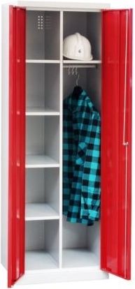 Wielofunkcyjna szafka gospodarcza SMD 61 to metalowy mebel socjalny służący do przechowania odzieży, środków czystości, wiader, szczotek, itp. Szafa skrytkowa ułatwia pracę pracownikom socjalnym oraz służbom sprzątającym. Szafka socjalno-gospodarcza SMD 61, wyposażona wewnątrz lewego segmentu - w 4 półki, wewnątrz prawego segmentu - w górną półkę, poniżej w drążek z 3 przesuwanymi wieszakami na ubranie. Szafka zamykana zamkiem cylindrycznymi z ryglowaniem w 2 punktach. Przed zakupem prosimy o kontakt w celu potwierdzenia dostępności towaru oraz jego koloru. Produkty najczęściej dostępne w kolorze popielatym (RAL 7035). W przypadku wyboru innego koloru termin realizacji zamówienia może się wydłużyć. Zdjęcia poglądowe. Wyposażenie zaprezentowane na zdjęciu może się różnić w zależności od modelu.