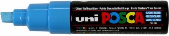 Marker Uni POSCA PC-8K tusz pigmentowy na bazie wody (w markerach zastosowano farbę plakatową) farba jest gęsta i charakteryzuje się dużą siłą krycia, można ją mieszać, rozwadniać i nakładać warstwowo tusz nie przesiąka przez papier, a różne kolory tuszu po wyschnięciu nie łączą się ze sobą pisze po każdej powierzchni: papierze, porcelanie, tkaninie, plastiku, terakocie, szkle, metalu, drewnie kulka znajdująca się w zbiorniku umożliwia dokładne wymieszanie farby i uzyskanie jednolitego pokrycia nasączanie końcówki farbą poprzez kilkukrotne przyciśnięcie jej do powierzchni odporny na działanie światła odporny na działanie warunków atmosferycznych końcówka ścięta grubość linii pisania: 8 mm kolor niebieski Utrwalenie koloru: tkaniny - przeprasować tkaninę na lewej stronie, nie używając pary porcelana i ceramika - wypiekać w piekarniku przez 30 min w 120°C lub utrwal werniksem drewno, bambus, korek - zabezpieczyć warstwą werniksu w sprayu metal - zabezpieczyć 2-3 warstwami werniksu w sprayu papier (od kalki kreślarskiej do papieru foto) - zabezpieczyć warstwą werniksu w sprayu szkło przezroczyste, nieprzezroczyste, barwione oraz lustro - wypiekać w piekarniku przez 45 minut w 160°C minerały, glina, masy modelarskie, kamienie, porowate skały, cement i pochodne - pokryć rysunek werniksem w sprayu lub wypiekać w piekarniku w 220°C tworzywa sztuczne - pozwolić farbie wyschnąć i utrwalić werniksem w sprayu