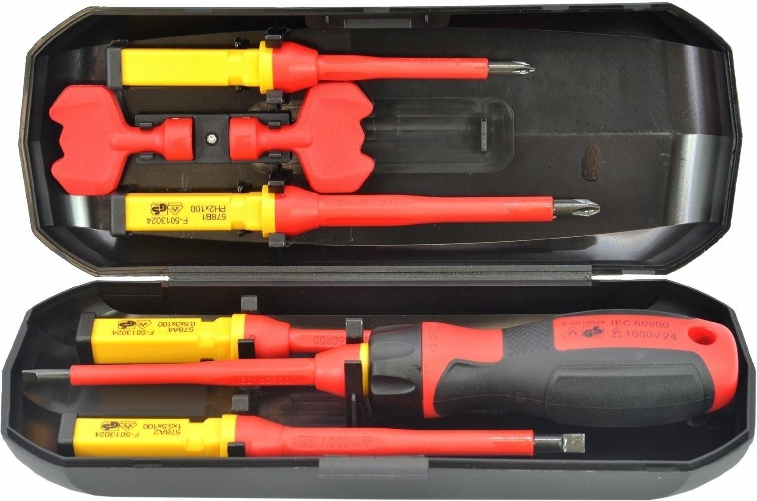 Wykonane z hartowanej stali CrV, wyposażone w utwardzany, magnetyczny i oksydowany grot. Izolowany uchwyt oraz ostrze chronią przed porażeniem prądem podczas pracy przy obwodach pod napięciem. Dzięki izolacji VDE, każdy z wkrętaków jest bezpieczny do użytku przy napięciu do 1000V. Atypoślizgowy, 2-komponentowy uchwyt wyposażony w szybkozłączkę, umożliwiającą łatwą wymianę grotów. Idealny do obsługi gniazdek elektrycznych, przełączników i innych elementów elektrycznych pod napięciem. Całość w etui z tworzywa. Zestaw zawiera: 2x wkrętaki Phillips: PH2x100mm, PH1x80mm 3x wkrętaki płaskie: 1x5.5x100mm, 0.8x4x100mm, 0.5x3x100mm 1x wymienny uchwyt 2x kluczyki do szaf rozdzielczych Waga: 400g