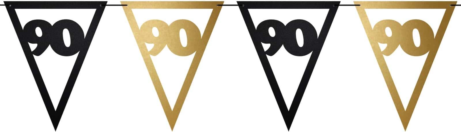 Baner flagi z papieru perłowego na 90 urodziny. Długość wstążki: 5 m. Wysokość flagi: ok 23 cm. Opakowanie: 1 kpl (10 flag). 5 flag złotych, 5 flag czarnych.