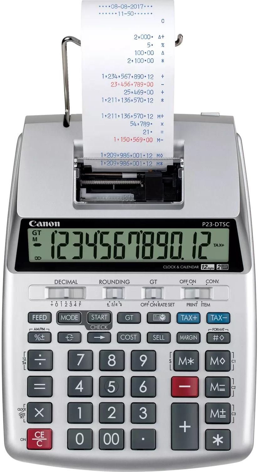 Kalkulator z drukarką Canon P23-DTSC II Ten kieszonkowy 12-cyfrowy, 2-kolorowy kalkulator zapewnia specjalistom niezwykłą mobilność drukowania wraz z kompleksowymi funkcjami podatkowymi, biznesowymi i konwersji walut. Wydajny i elegancki ze srebrnym metalicznym wykończeniem. Mobilny 12-cyfrowy, …