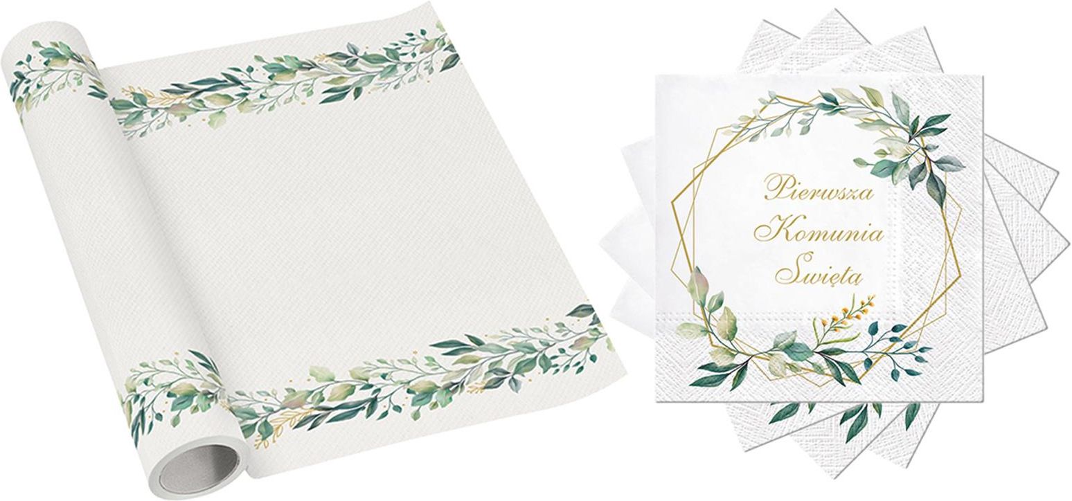 Zestaw dekoracji na stół na I Komunię Świętą w motywie listków. W komplecie: - 20 serwetek 3-warstwowych - 33 cm (po rozłożeniu), - bieżnik na stół - 40 cm x 5 m.