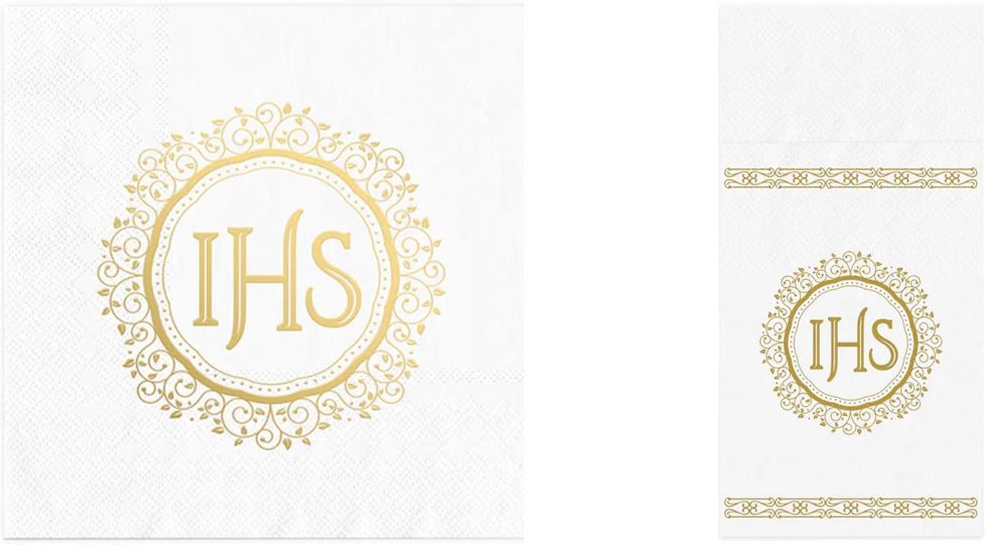 Zestaw dekoracji na stół na I Komunię Świętą. W komplecie: - 20 serwetek 3-warstwowych IHS ze złotym ornamentem - 33 cm (po rozłożeniu), - 16 kieszonek na sztućce IHS ze złotym ornamentem - 40 x 40 cm (po rozłożeniu).