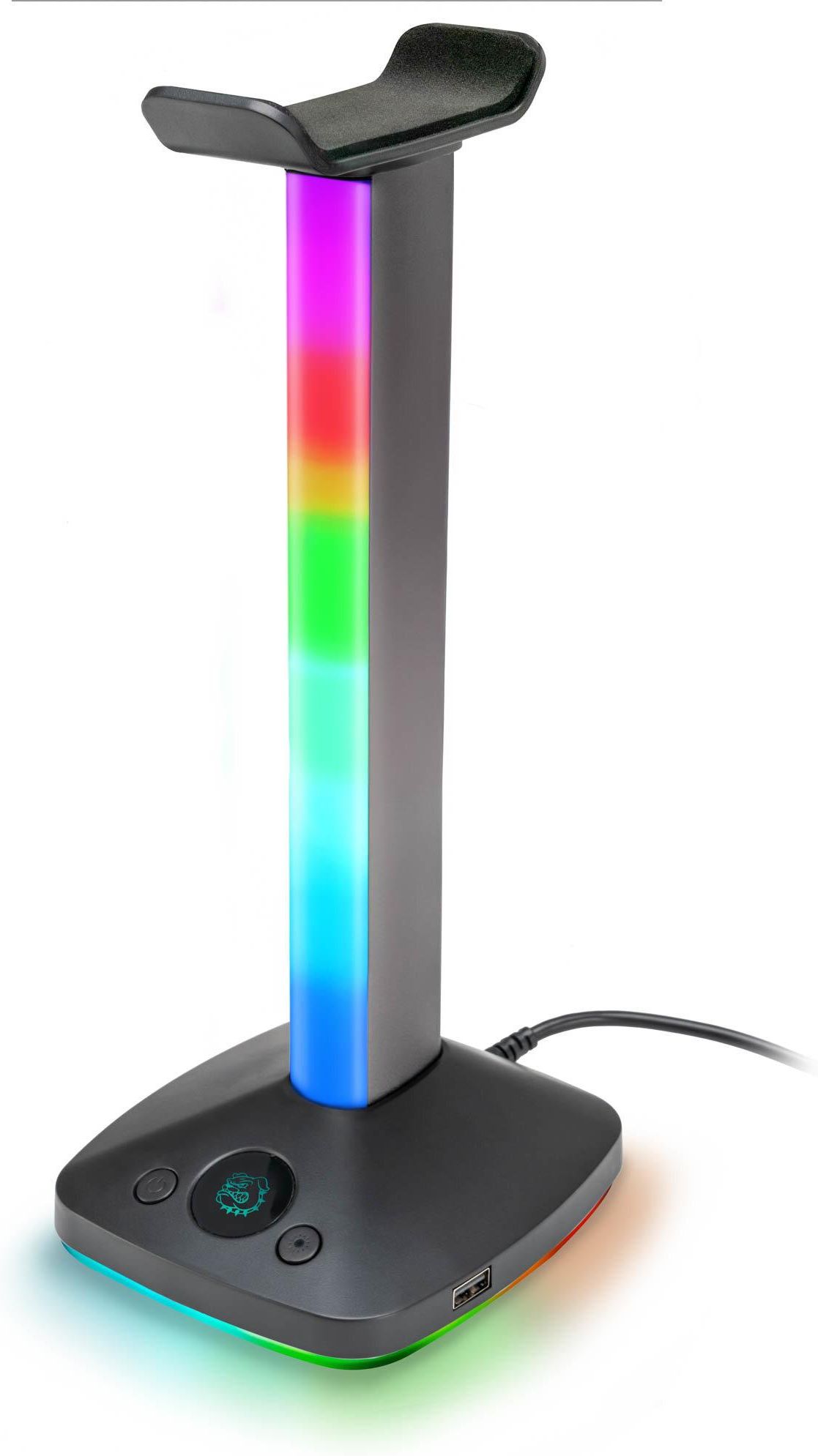 Stojak na słuchawki MAD DOG HPS800K wykonany z aluminium i ABS. Wyposażony jest w podświetlenie RGB oraz trzy porty USB 2.0, co ułatwia podłączanie dodatkowych urządzeń.