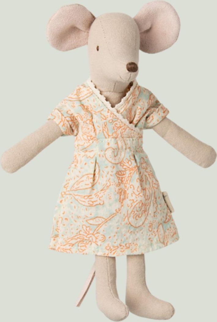 Maileg - Myszka mama w sukience Myszka mama w lekkiej sukience to klasyczny produkt marki Maileg. Idealnie pasuje do mebli i akcesoriów w rozmiarze myszki. Możesz dokupić więcej ubrań osobno. Ubrania w rozmiarze mama/tata pasują do tej myszki. Cechy produktu: Wysokość: 15.00 cm Waga netto: 0.02 kg Materiał główny: Bawełna Wypełnienie: Recyklingowany poliester/PP pellets Instrukcje pielęgnacji: Można prać w pralce w 30 stopniach C