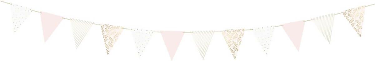 Piękna girlanda z uroczym złotym nadrukiem stworzy niepowtarzalną atmosferę na przyjęciu. Można ją zawiesić w dowolnym miejscu w domu lub ogrodzie. Wysokość flagi - 18 cm Dekoracja składa się z 12 flag w 4 wzorach: pudrowy róż, biała w złote paski, biała w złote kropki i pudrowy róż w złote gałązki.