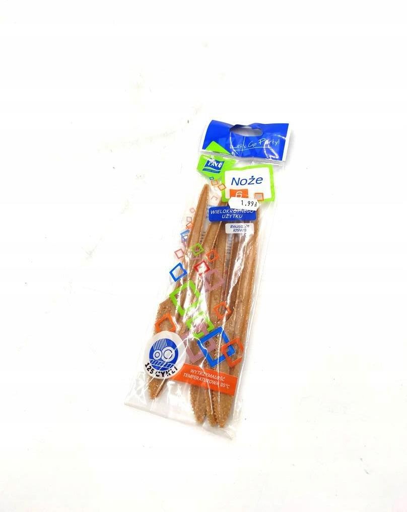RAVI NOŻE WIELOKROTNEGO UŻYTKU DO ZMYWARKI 6 SZTUK Sztućce zostały wykonane z kompozytu drewna i polimeru. Są produktem wielorazowym, można myć je w zmywarce bez obaw o pogorszenie się ich właściwości (do 125 cykli mycia w zmywarce). Dzięki wysokiej odporności na temperatury zachowują sztywność nawet w 95°C. Idealne się sprawdzą na imprezie, na grillu czy na kempingu. Charakterystyka: - ilość: 6 sztuk - długość: 18 cm - szerokość: 2,1 cm - materiał: PP + włókna drewna - mogą zostać poddane recyklingowi