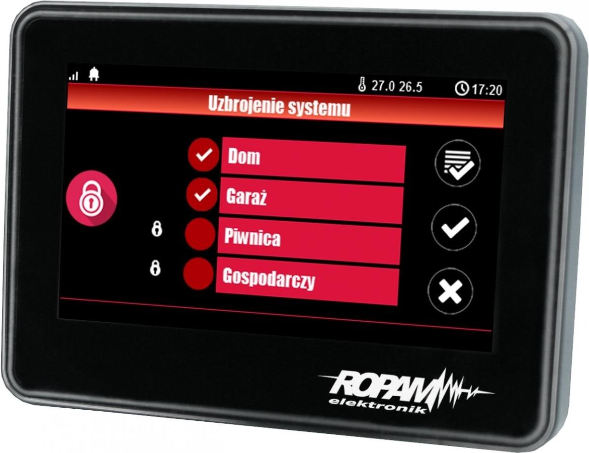 Panel dotykowy TPR-4 to nowoczesny element sterowania i kontroli systemu alarmowego, przeznaczony do systemu OptimaGSM. Nowoczesna stylistyka, sprawdzona technologia wraz z efektownym kolorowym wyświetlaczem LCD doskonale nadaje się do aranżacji w większości wnętrz i pomieszczeń. Intuicyjny i przejrzysty interfejs, powoduje, że sterowanie systemem alarmowym i automatyka domową nigdy nie było tak proste. Główne cechy: kolorowy wyświetlacz 4,3” TFT LCD, LED, o wysokim kontraście i jasności, estetyczne i ekskluzywne wykonanie: zintegrowany szklany panel z wyświetlaczem w niskoprofilowej obudowie, panel dotykowy „TouchPanel”, bez mechanicznych styków, pojemnościowy, obsługa gestów, interaktywne graficzne menu z piktogramami (ikonami), dwa ekrany z możliwością dowolnego umieszczenia piktorgramów, wg. wymagań aplikacji lub użytkownika, wizualizacja i sterowanie automatyką domową, funkcja termostatu pokojowego (2 niezależne), kalendarz tygodniowy, pięć profili temperatury,, cztery przedziały dzienne, synchronizacja na wybranych panelach i aplikacji mobilnej (IP), funkcja losowego układu klawiatury numerycznej, tekstowe podpowiedzi dla danych funkcji, pasek dodatkowych informacji o stanie systemu, sygnalizacja akustyczna, wygaszacz ekranu z funkcją kalendarza, zegara i aktualnej temperatury, dwa wejścia alarmowe, funkcja rejestratora temperatury LoggerTemp: zapis historii temperatury na karcie SD, (txt) i/lub podgląd histogramu w trybie wygaszacza ekranu, magistrala EIA-485 do komunikacji z centralami, protokół RopamNET, lokalny port USB micro do aktualizacji firmware, zabezpieczenie antysabotażowe obudowy, wymiary:122x88x17 mm (WxHxD) (bez złącz), kolor obudowy, ramki: biały RAL9004. Zastosowanie: Panele dotykowe serii TPR-4 i inne urządzenia dodatkowe to idealne rozwiązanie dla obiektów mieszkalnych i małych obiektów komercyjnych. Nowoczesna stylistyka, sprawdzona technologia panelu dotykowego z efektownym kolorowym wyświetlaczem LCD doskonale nadaje się do komponowania w większości wnętrz i pomieszczeń. Intuicyjny i przejrzystyinterfejs, powoduje, że sterowanie systemem alarmowym/automatyką domową nigdy nie było tak proste jak z panelami dotykowymi serii TPR-4. Panel dotykowy w połączeniu z centralami serii: OPTIMAGSM pozwala na zbudowanie w pełni funkcjonalnego systemu alarmowego/automatyki domowej. Elastyczne funkcje pozwalają ponadto na stosowanie w systemach, w których wykorzystuję się kontrolę sygnałów binarnych, temperaturę, wilgotności wymagana jest weryfikacja wizualna a przesyłanie informacji opiera się na SMS, VOICE, MMS, e-mail
