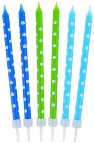 Wielki zestaw świeczek w modne grochy. W opakowaniu znajduję się 24 sztuki świeczek w 3 różnych kolorach. Każda świeczka ma u podstawy plastikowe mocowanie dzięki któremu łatwo umieścimy ją w torcie. Świeczki są wysokie i smukłe, mają ok 10 cm wysokości. WYDAWNICTWO: GODAN ROK WYDANIA: 0 WYSOKOSC: 200 GLEBOKOSC: 0 LICZBA STRON: 0