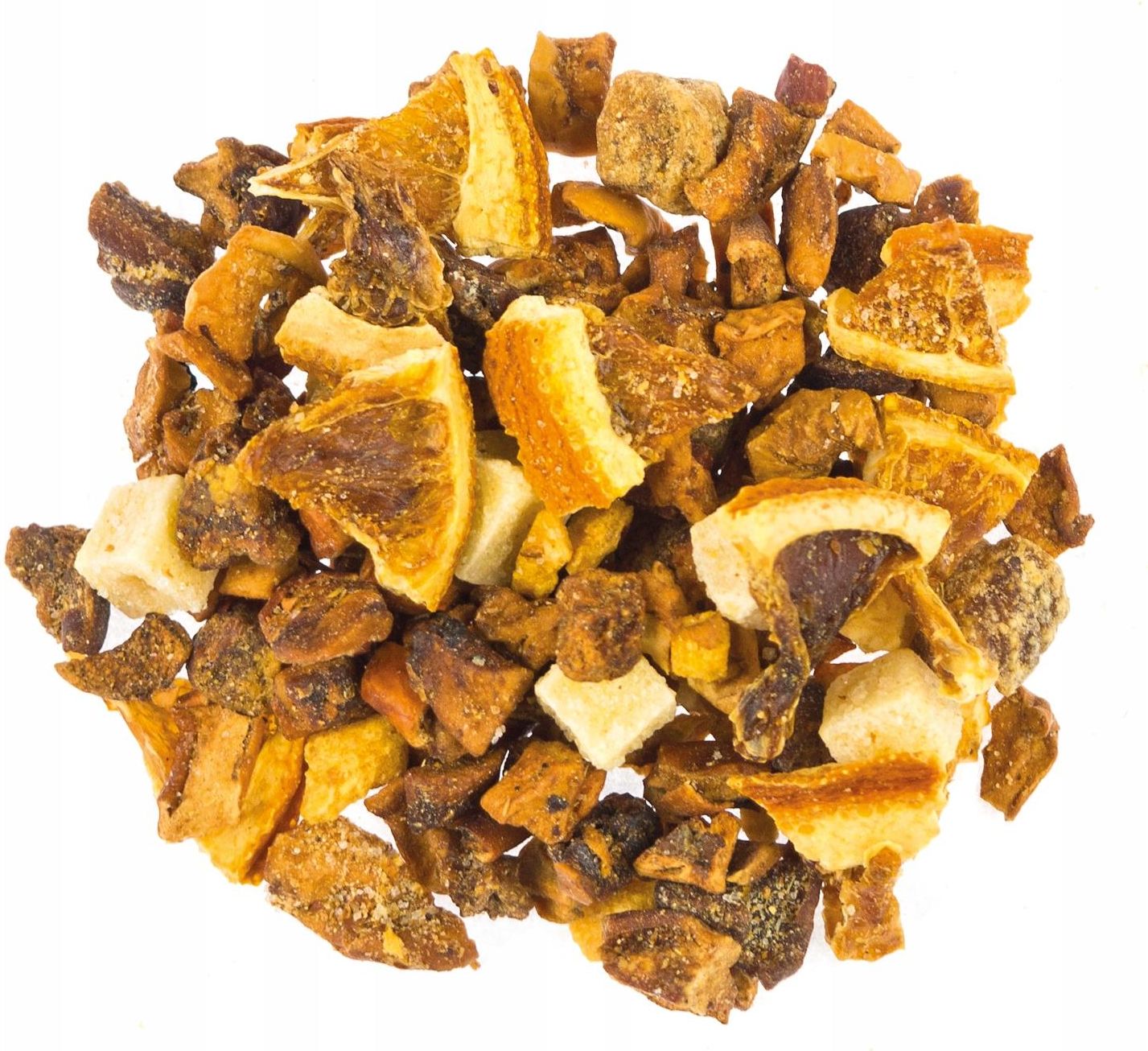 Skład: jabłka, gruszki, figi, daktyle, skórka pomarańczy, ćwiartki pomarańczy, imbir, witamina C, naturalny kwasek cytrynowy, aromat Herbata owocowa ma właściwości zdrowotne, które zależą od tego, który rodzaj suszu lub suszonych kawałków owoców dominuje w jej składzie. Może działać przeciwzapalnie, napotnie (np. herbata malinowa), wspierać pracę układu moczowego, poprawiać odporność, a nawet obniżać cholesterol. Parzenie Parzenie herbaty czasem przypomina przygotowywanie kawy. Na smak naszego naparu wpływają przede wszystkim: temperatura, gramatura i czas parzenia. Oprócz tego warto pamiętać, że pełniejszy aromat osiągniemy, gdy naczynie do parzenia zostanie wcześniej przez nas ogrzane. czas: 6-8 minut temperatura: 100°C ilość: 2 łyżeczki (200 ml) ilość parzeń: 1