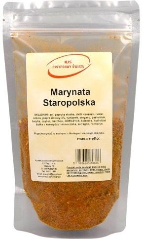Marynata staropolska 60g przyprawa stworzona z starannie wyselekcjonowanych ziół i przypraw dzięki, której marynowane mięso zyska wyjątkowy aromat. Zastosowanie: do mięsa wieprzowego do drobiu do mięs pieczonych w piekarniku i na grillu do karkówki pieczonej Marynatę można posypać bezpośrednio na mięso lub wcześniej wymieszać z olejem Skład: sól, papryka słodka, chilli, czosnek, cukier, cebula, pieprz ziołowy- 4%, tymianek, oregano, pasternak, bazylia, cząber, marchew, GORCZYCA, kolendra, hydrolizat białka z kukurydzy i słonecznika, estragon, rozmaryn Kraj pochodzenia: Polska Masa netto: 60g Produkt pakowany jest w opakowanie typu "doypack" ze struną, co pozwala na zachowanie długiej świeżości. To opakowanie pozwala na częste otwieranie i zamykanie. Gwarantuje trwałość i pewność co jest ważne podczas transportu. Przechowywać w suchym i ciemnym miejscu ! Produkt może zawierać śladowe ilości alergenów: gorczycę, seler, sezam, zboża zawierające gluten, orzechy, składniki mleka i jaj w proszku, soję !