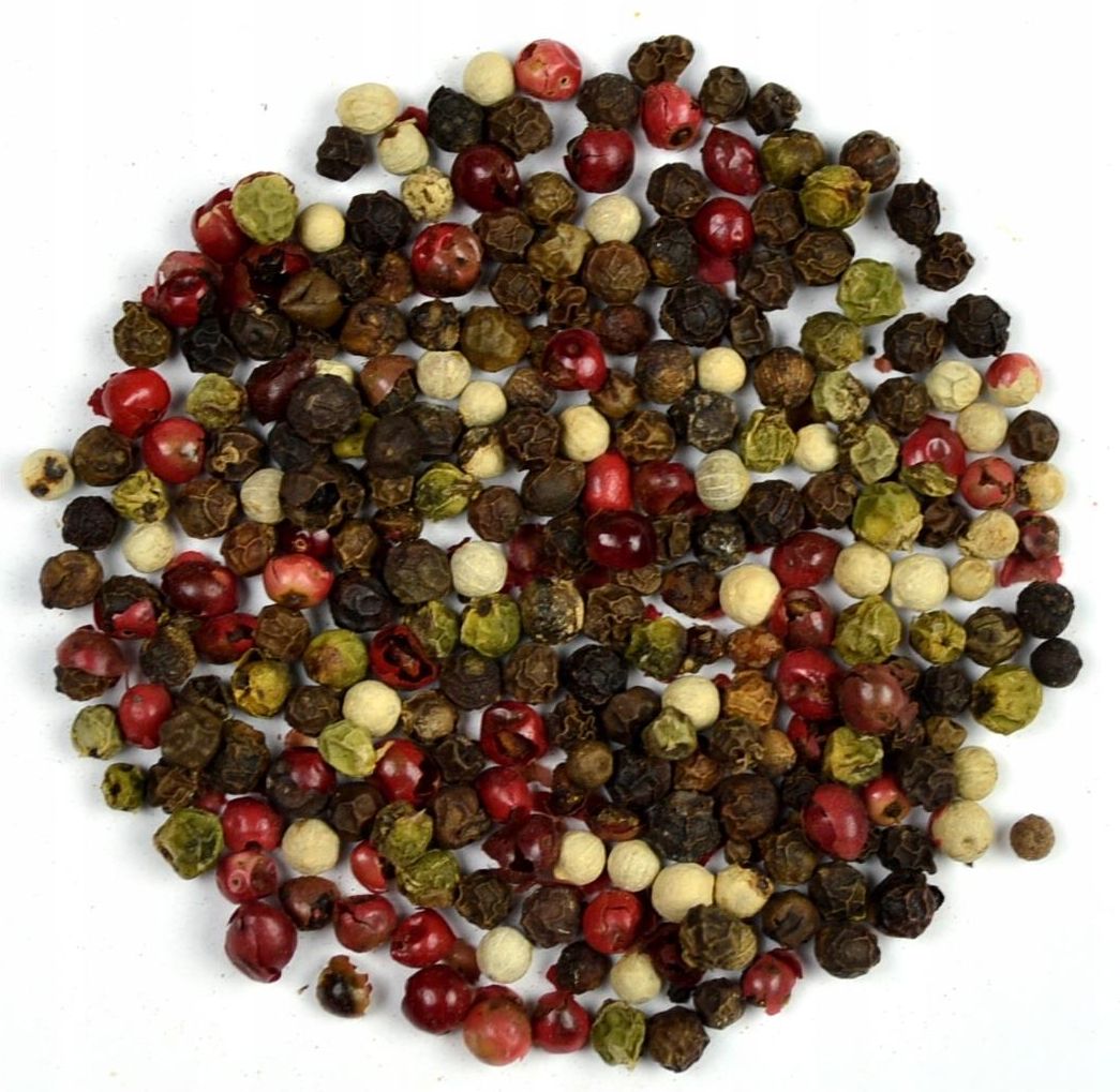 Pieprz kolorowy to rodzaj pieprzu stanowi mieszankę starannie dobranych owoców różnych roślin. Składają się na nią odmiany: czarna, biała, zielona i czerwona. Zastosowanie Zazwyczaj ten rodzaj pieprzu dodaje się do tych samych potraw, co jego czarny odpowiednik. Świetnie komponuje się z różnorakimi zupami, gulaszami, mięsem, rybami, marynatami i sałatkami. Sposób używania Pieprz kolorowy ziarno warto dodawać do potrawy podczas gotowania, albo smażenia potrawy. Dzięki wysokiej temperaturze ziarna rozpuszczą się i uwolnią cały swój aromat. Kraj pochodzenia: Polska Masa netto: 110 g Produkt pakowany jest w opakowanie typu "doypack" ze struną, co pozwala na zachowanie długiej świeżości. To opakowanie pozwala na częste otwieranie i zamykanie. Gwarantuje trwałość i pewność co jest ważne podczas transportu. Przechowywać w suchym i ciemnym miejscu ! Produkt może zawierać śladowe ilości alergenów: gorczycę, seler, sezam, zboża zawierające gluten, orzechy, składniki mleka i jaj w proszku, soję !