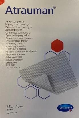 PRODUKT NOWY, NIEUSZKODZONY, NIEOTWIERANY. HARTMANN - Atrauman - 7.5 x 10 cm - 50 szt. Opatrunek z cienkiej hydrofobowej siateczki tiulowej. Zastosowanie: bezurazowe zaopatrywanie ran we wszystkich fazach gojenia (np. ran szarpanych, tłuczonych, otarć, owrzodzeń podudzia, odleżyn, oparzeń, sparzeń, …